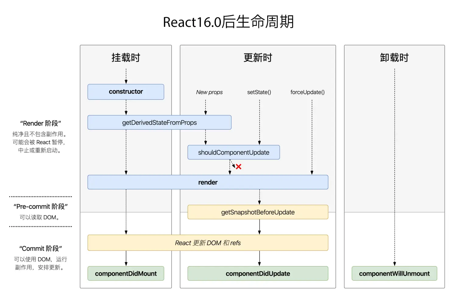 在 React 16 中,组件的生命周期方法是理解组件如何挂载、更新和卸载的关键。以下是 React 16 中组件生命周期的主要阶段及其对应的方法: